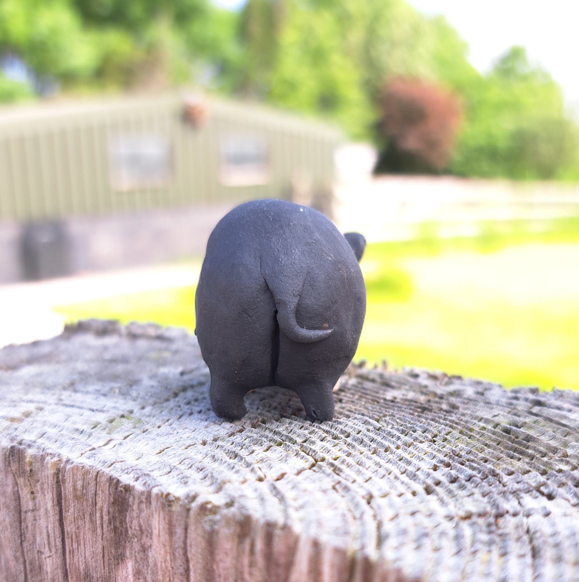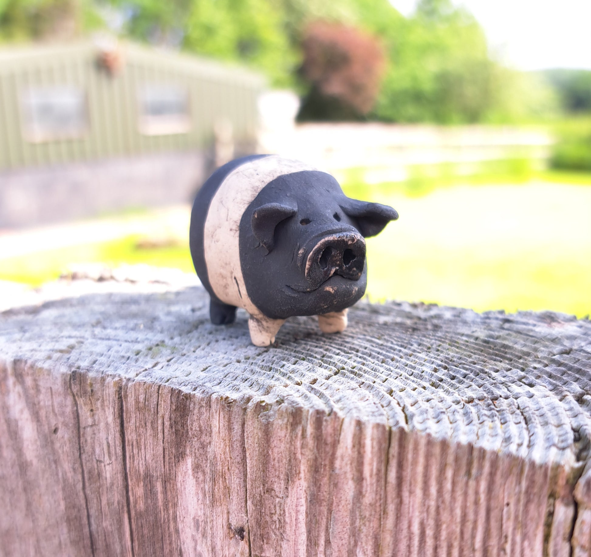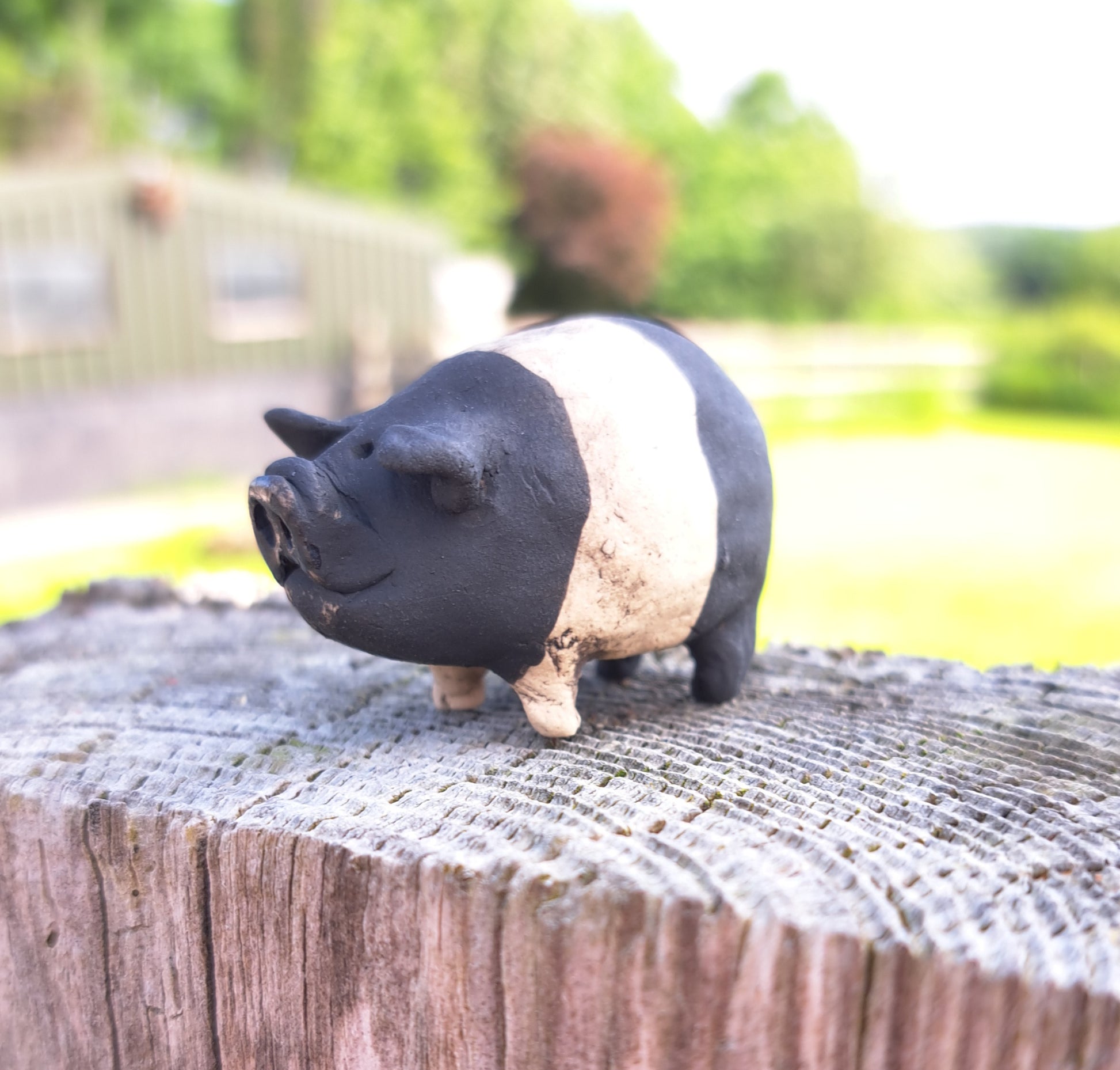 This delightful piggy has been hand-sculpted and then fired to around 1000°c. It has then been painted with underglazes, a slight glaze to the snout and then re-fired to around 1230°c