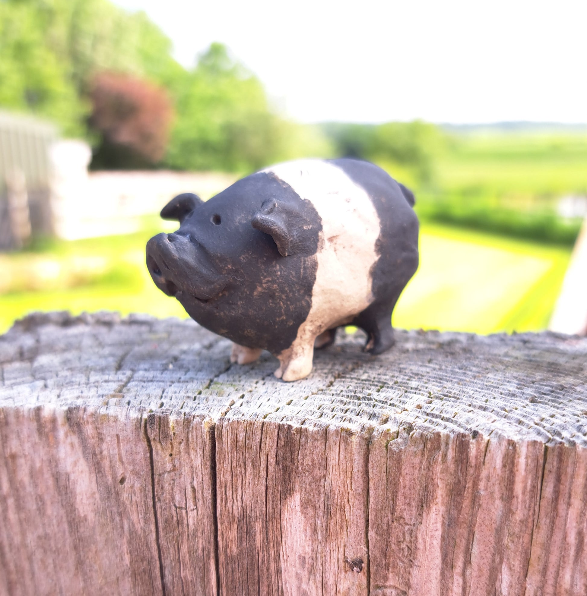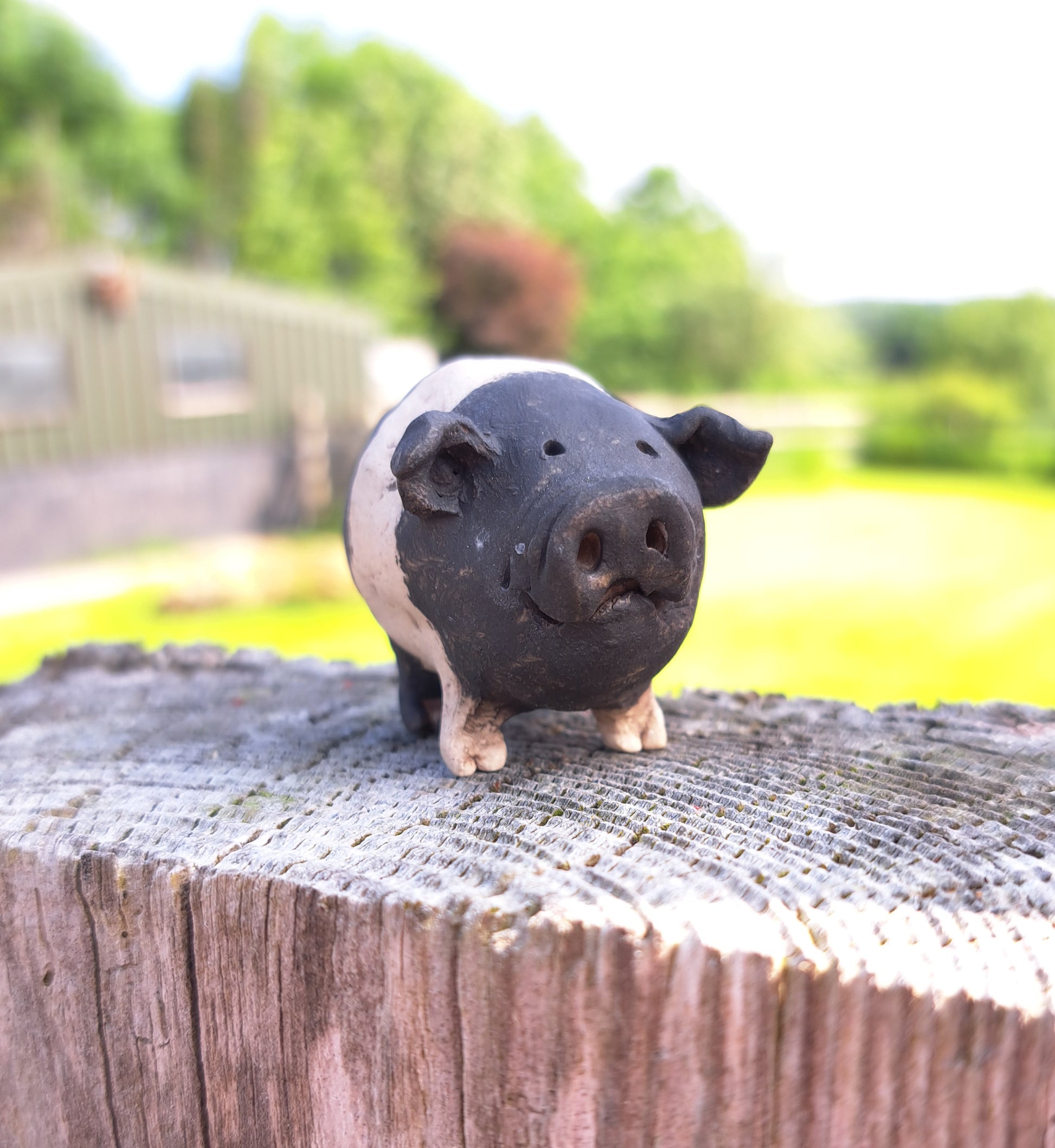 This delightful piggy has been hand-sculpted and then fired to around 1000°c. It has then been painted with underglazes, a slight glaze to the snout and then re-fired to around 1220°c.