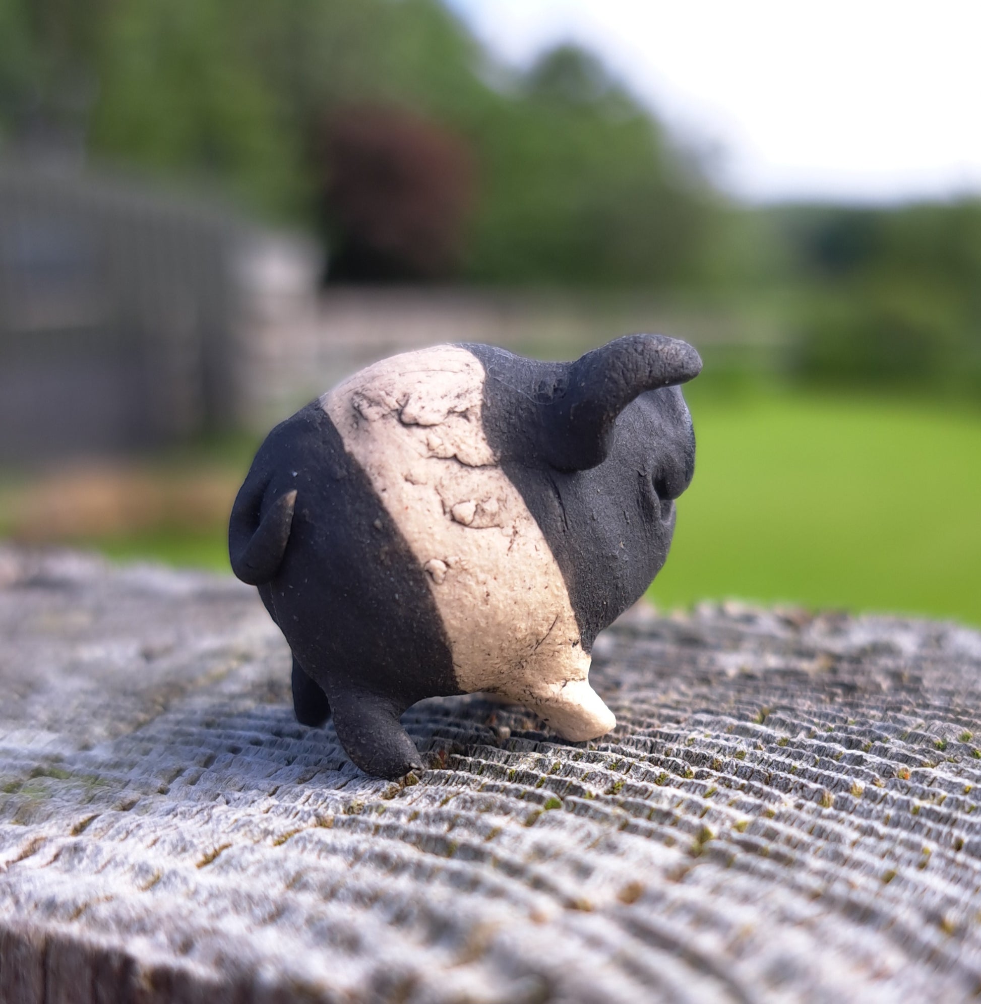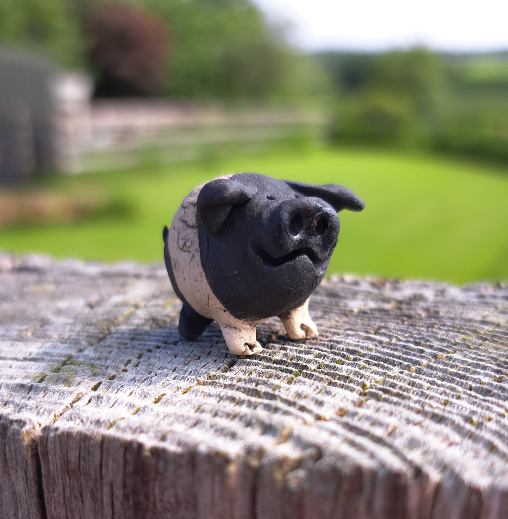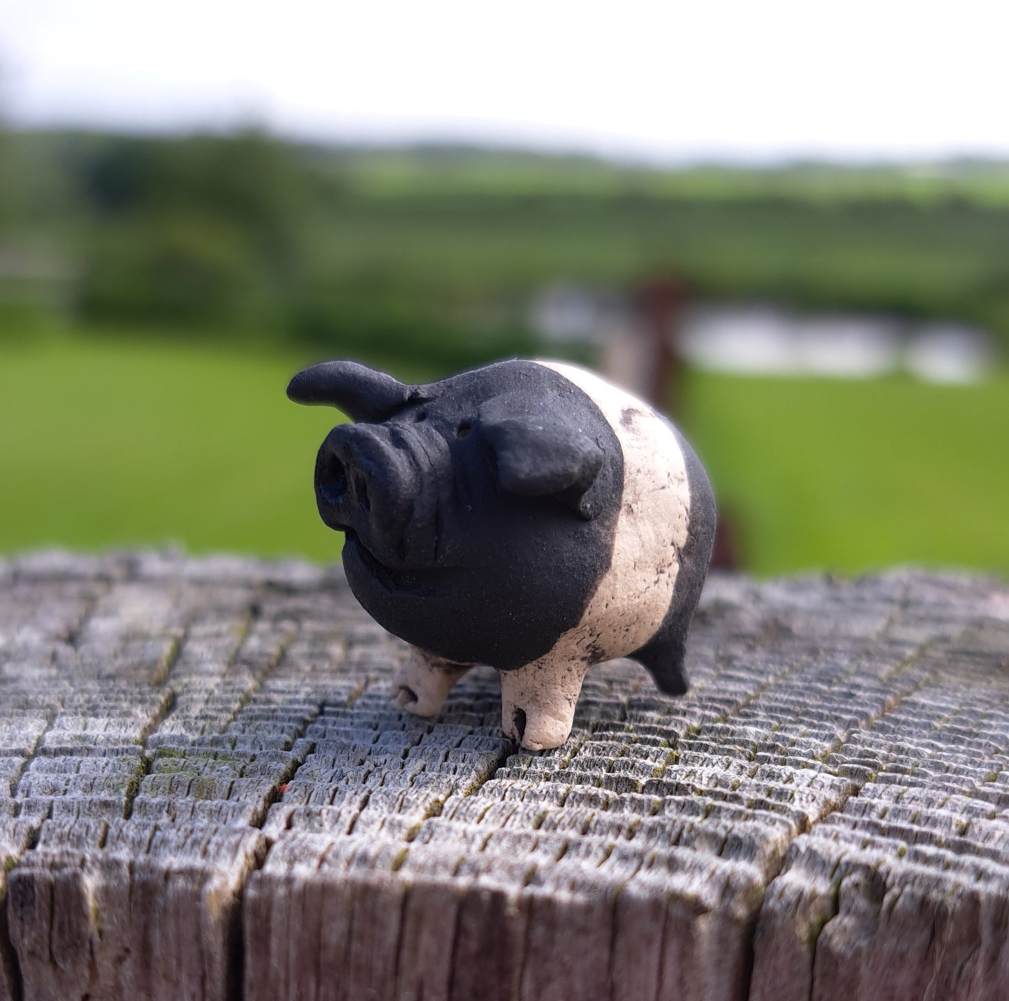 This delightful piggy has been hand-sculpted and then fired to around 1000°c. It has then been painted with underglazes, a slight glaze to the snout and then re-fired to around 1220°c
