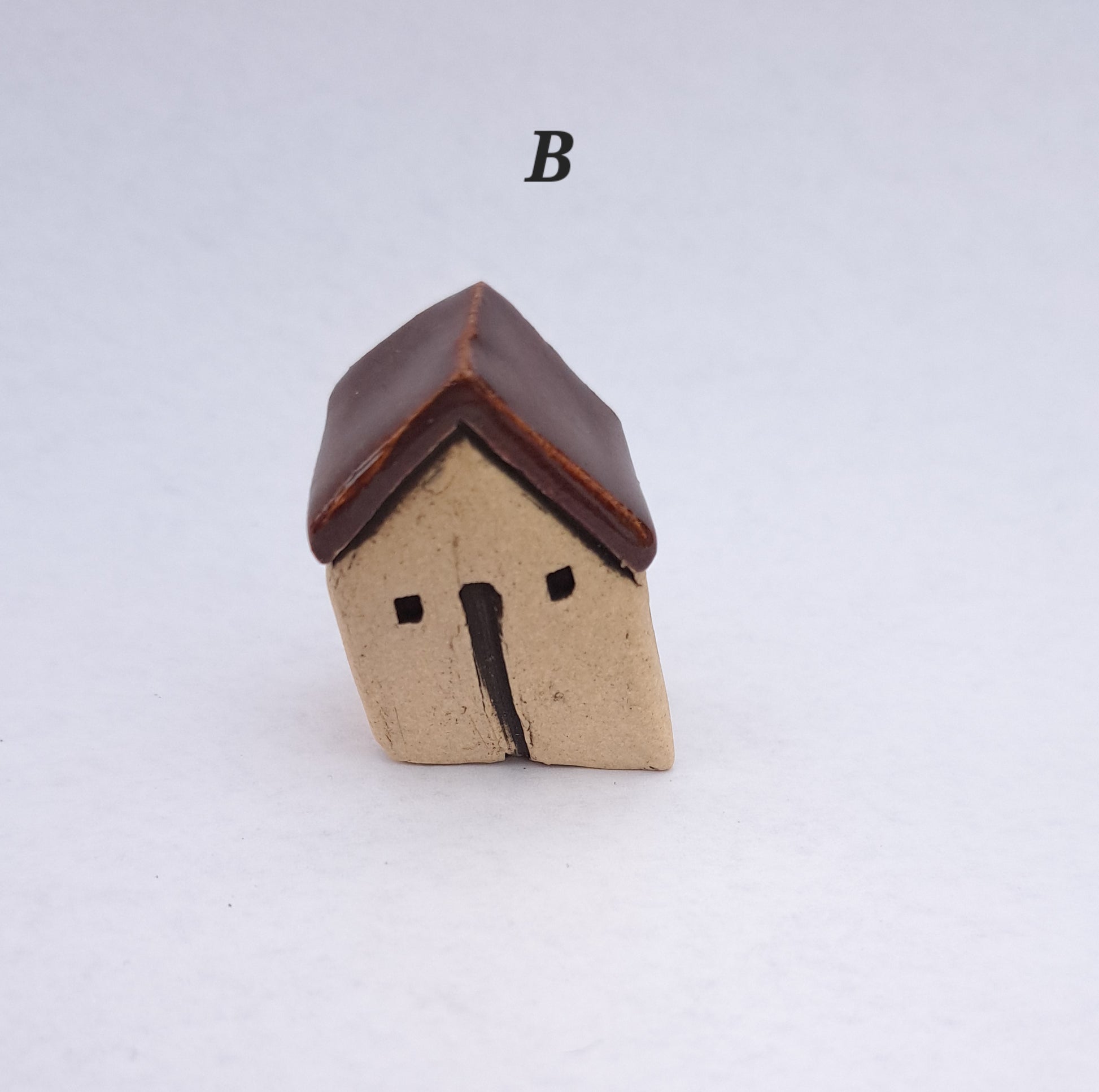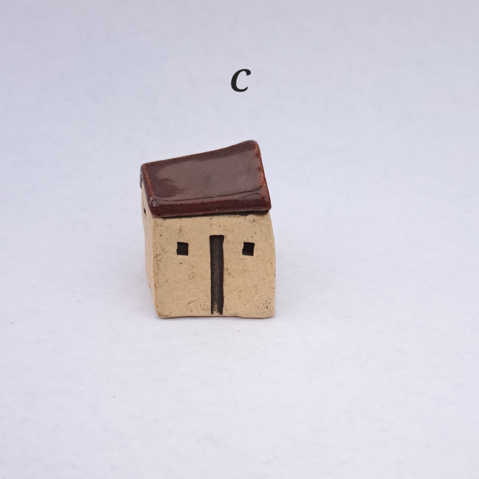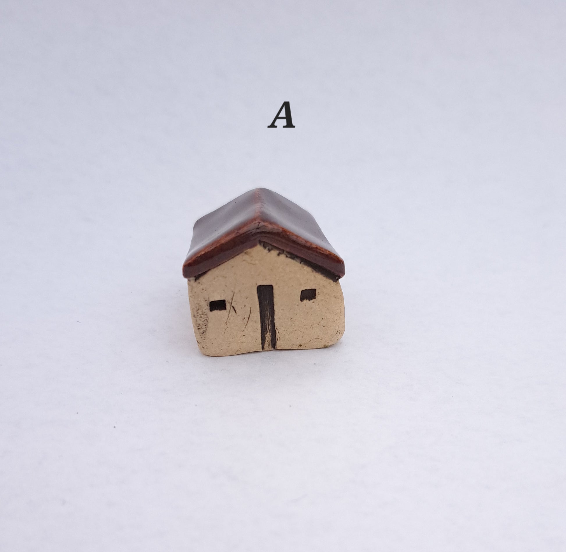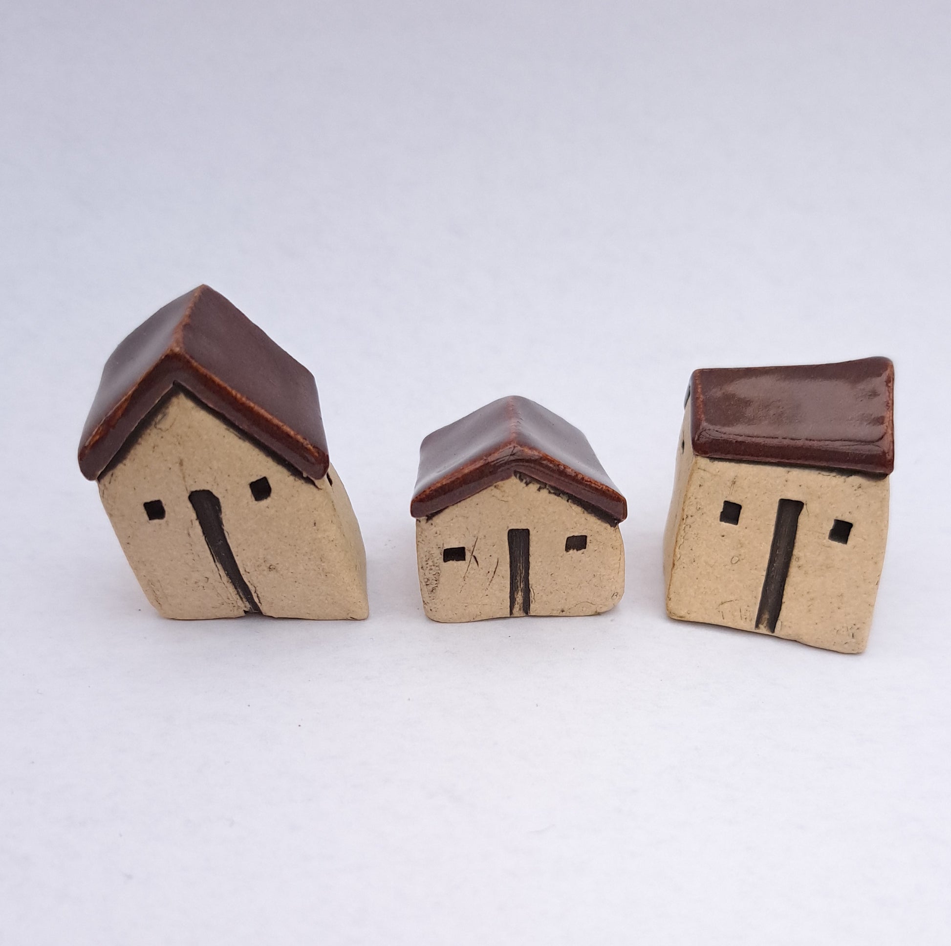 These quaint little ceramic houses are all hand-made and unique all with their own character. The walls are a cream coloured clay with a black stain. The roof is finished with a beautiful dark maroon glaze.