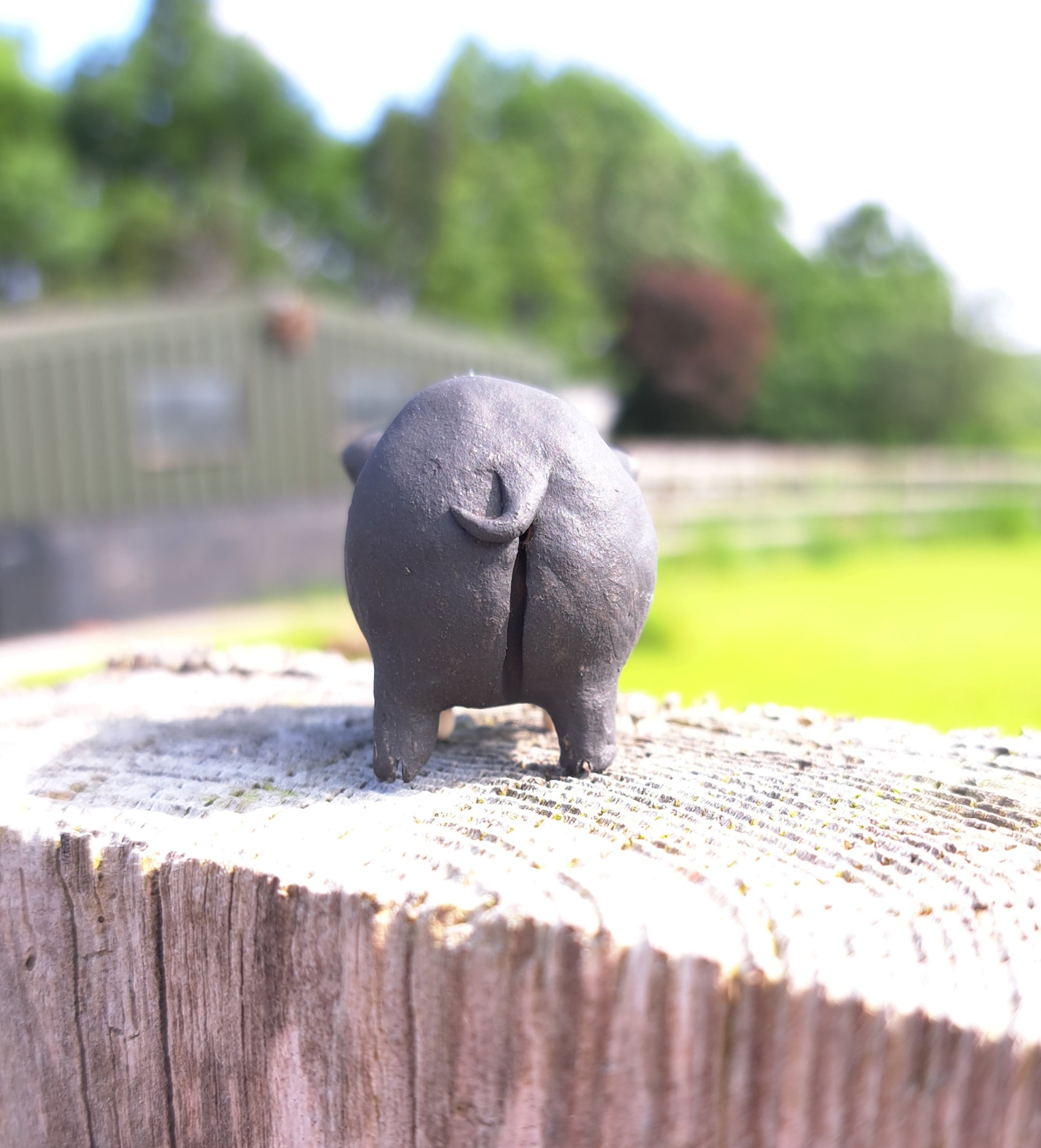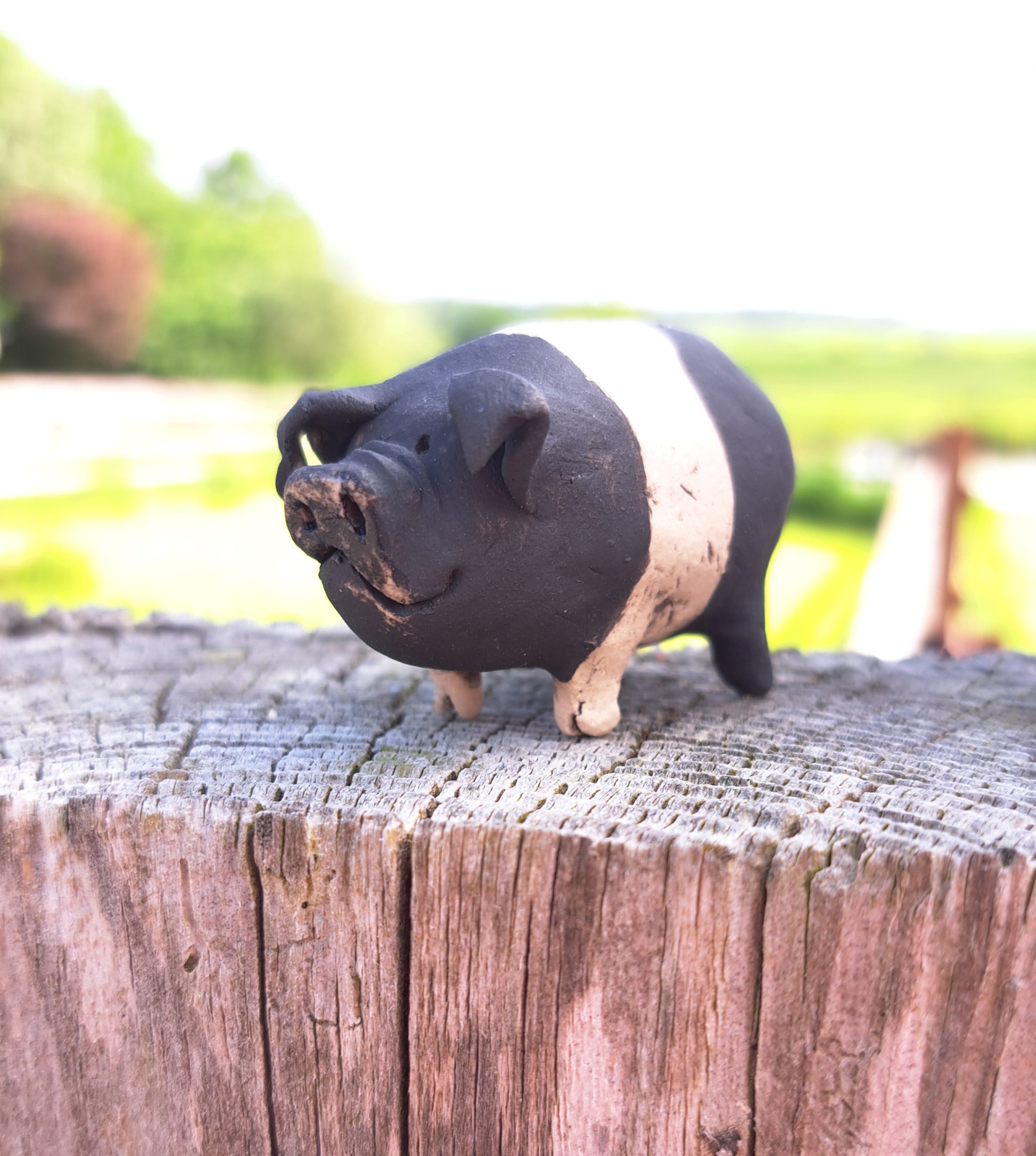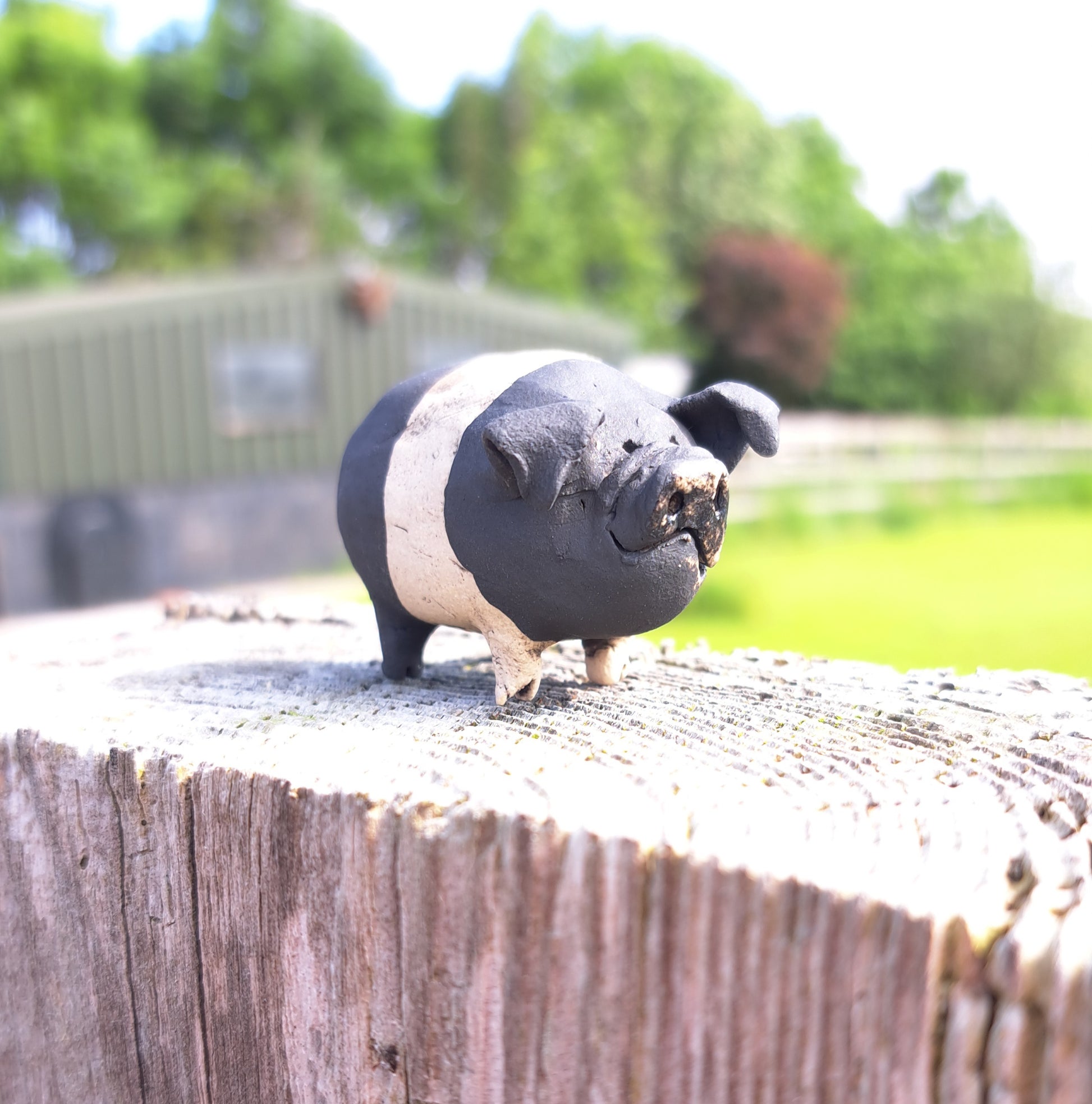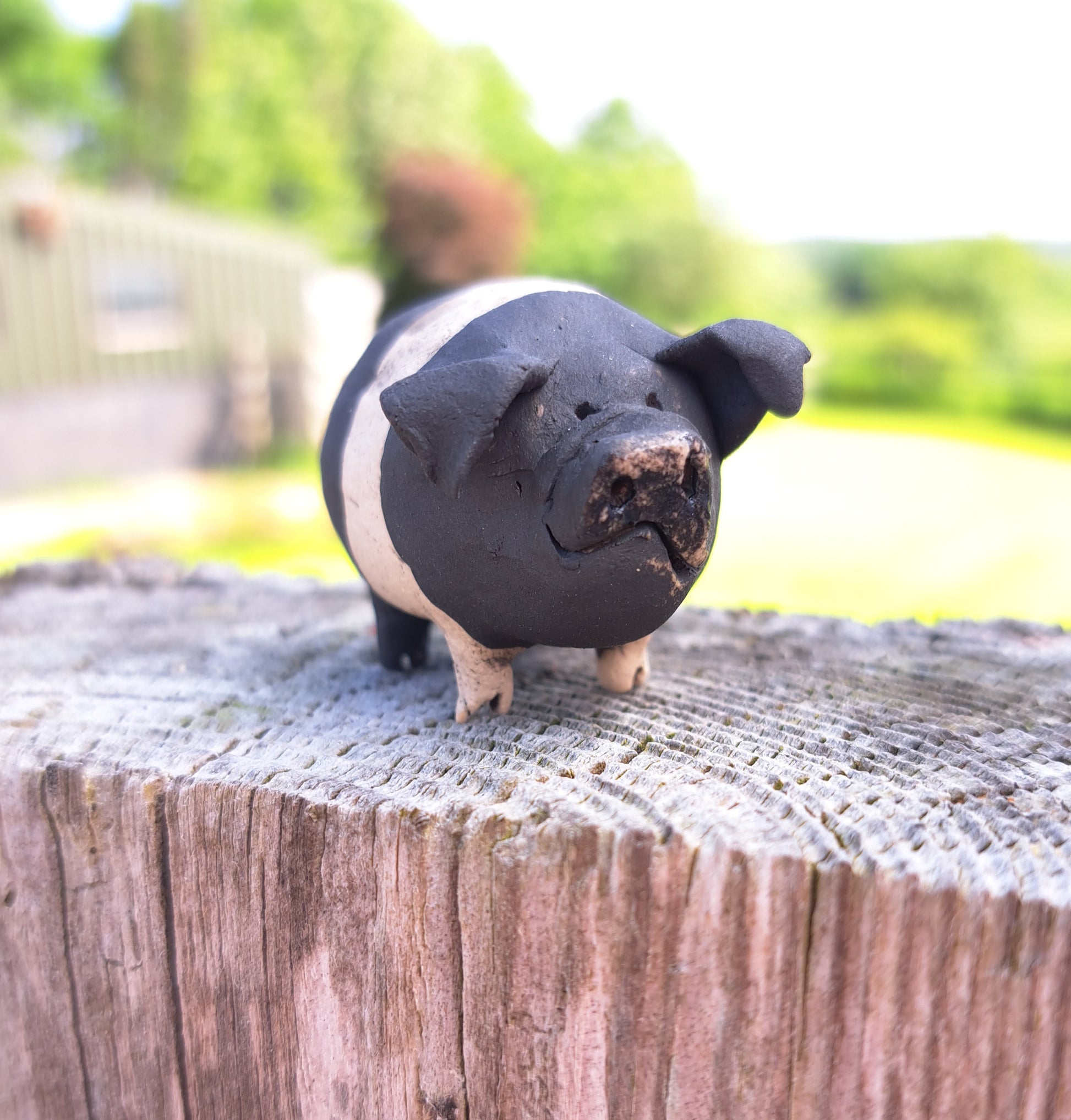 This delightful piggy has been hand-sculpted and then fired to around 1000°c. It has then been painted with underglazes, a slight glaze to the snout and then re-fired to around 1220°c.
