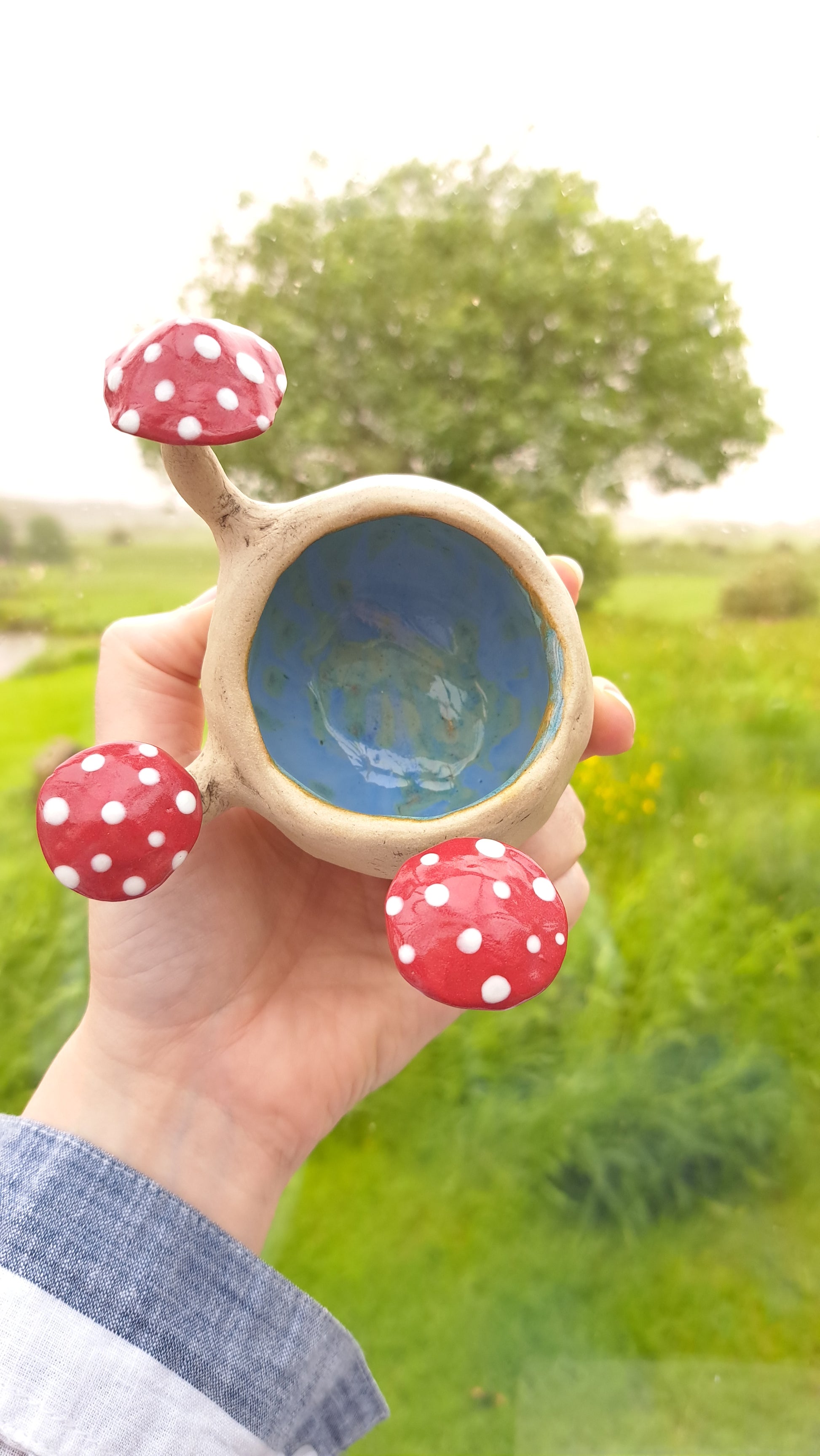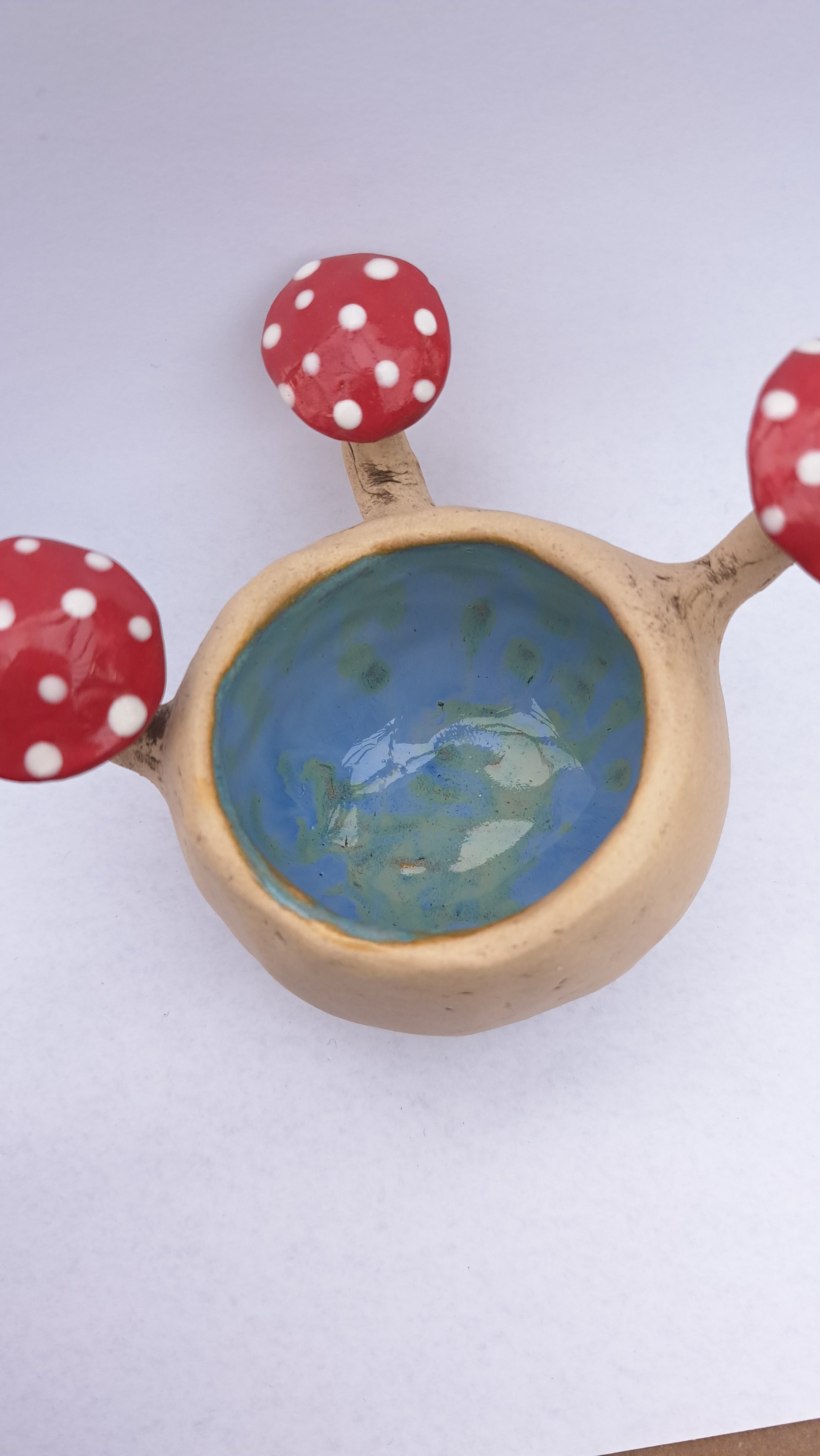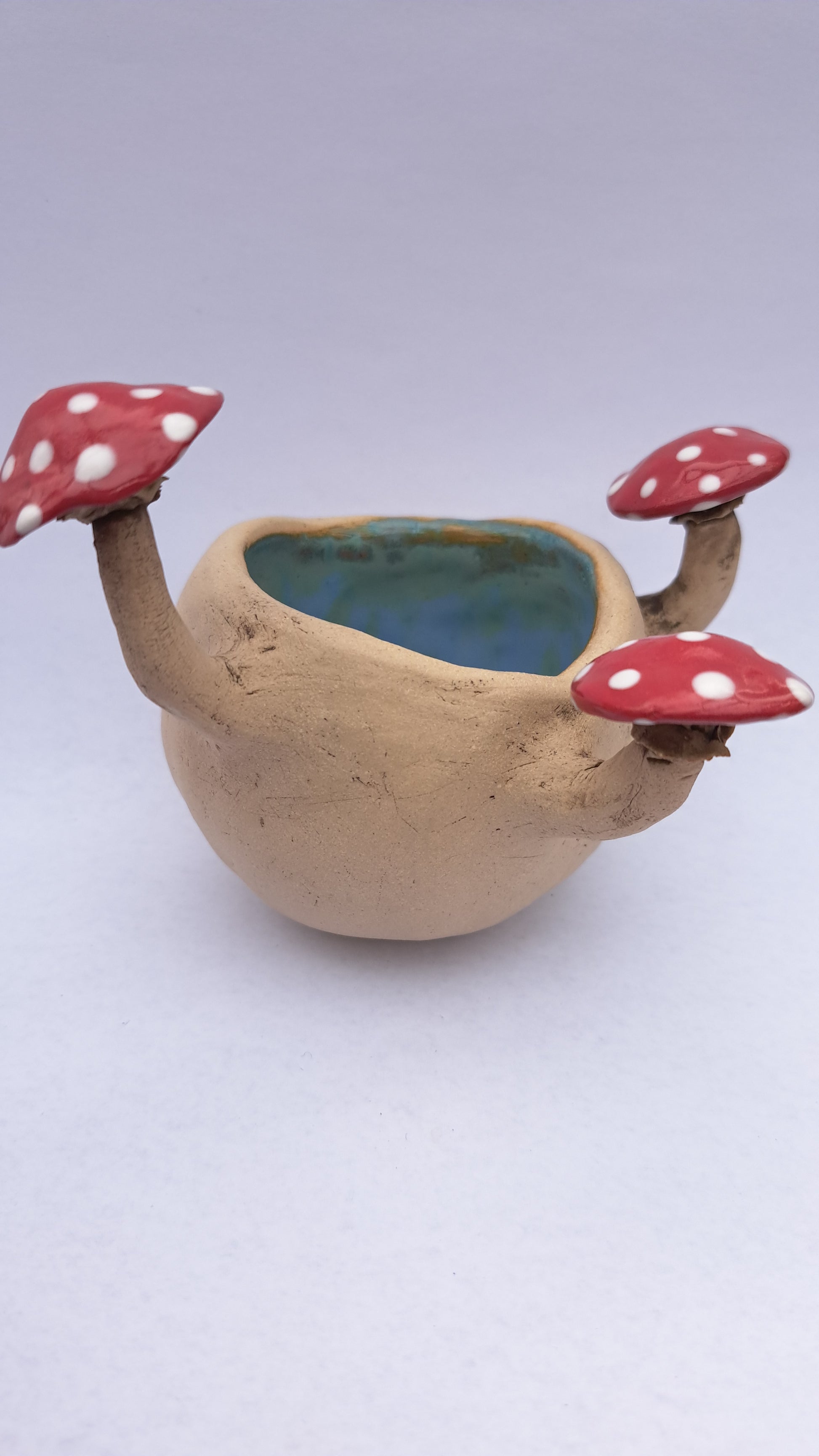 These quirky small ceramic mushroom pots have been entirely hand-sculpted. The outside has been left unglazed and the inside has been glazed with a beautiful bluey/green glaze. The mushrooms are covered in a transparent glossy glaze.