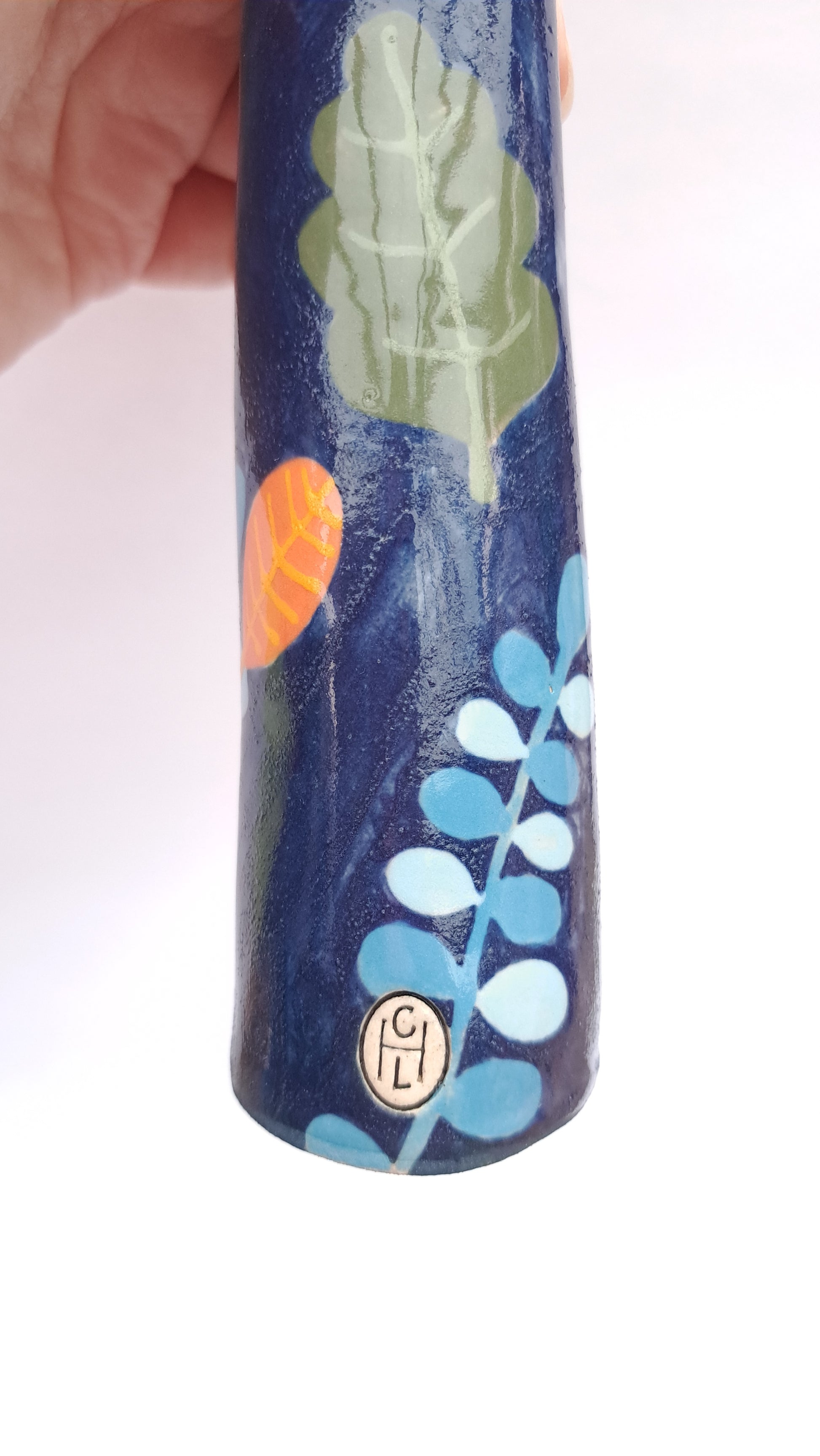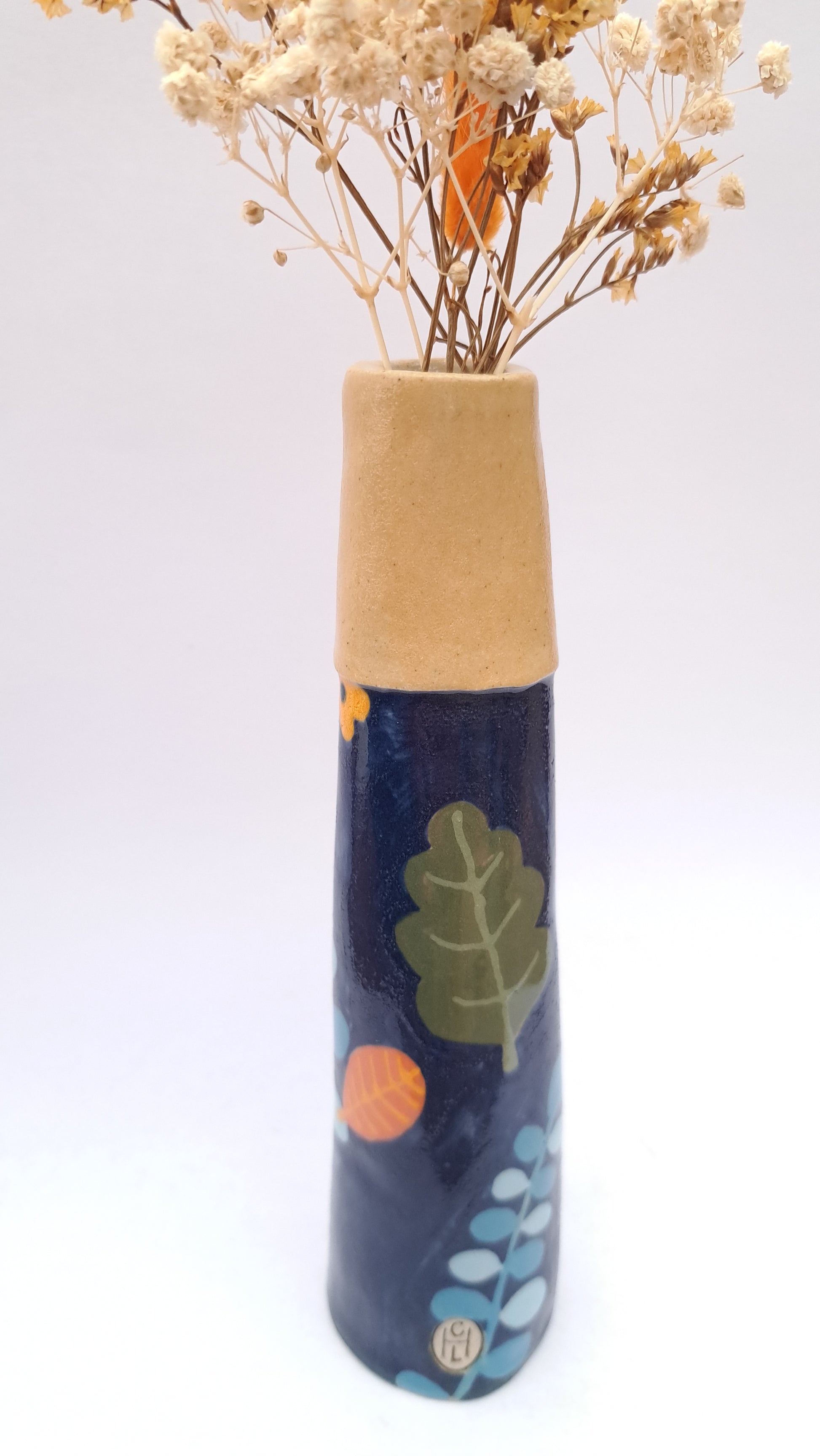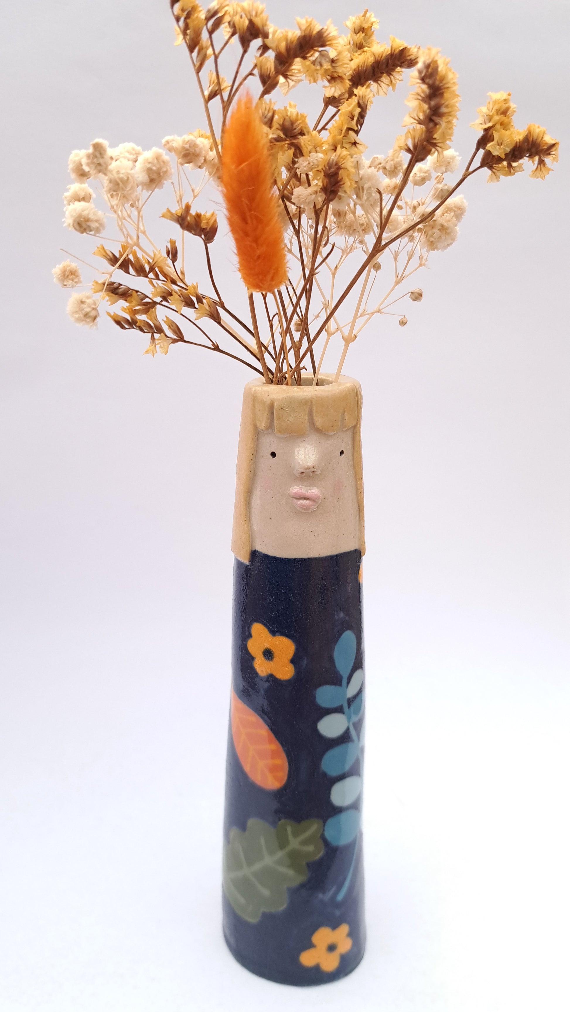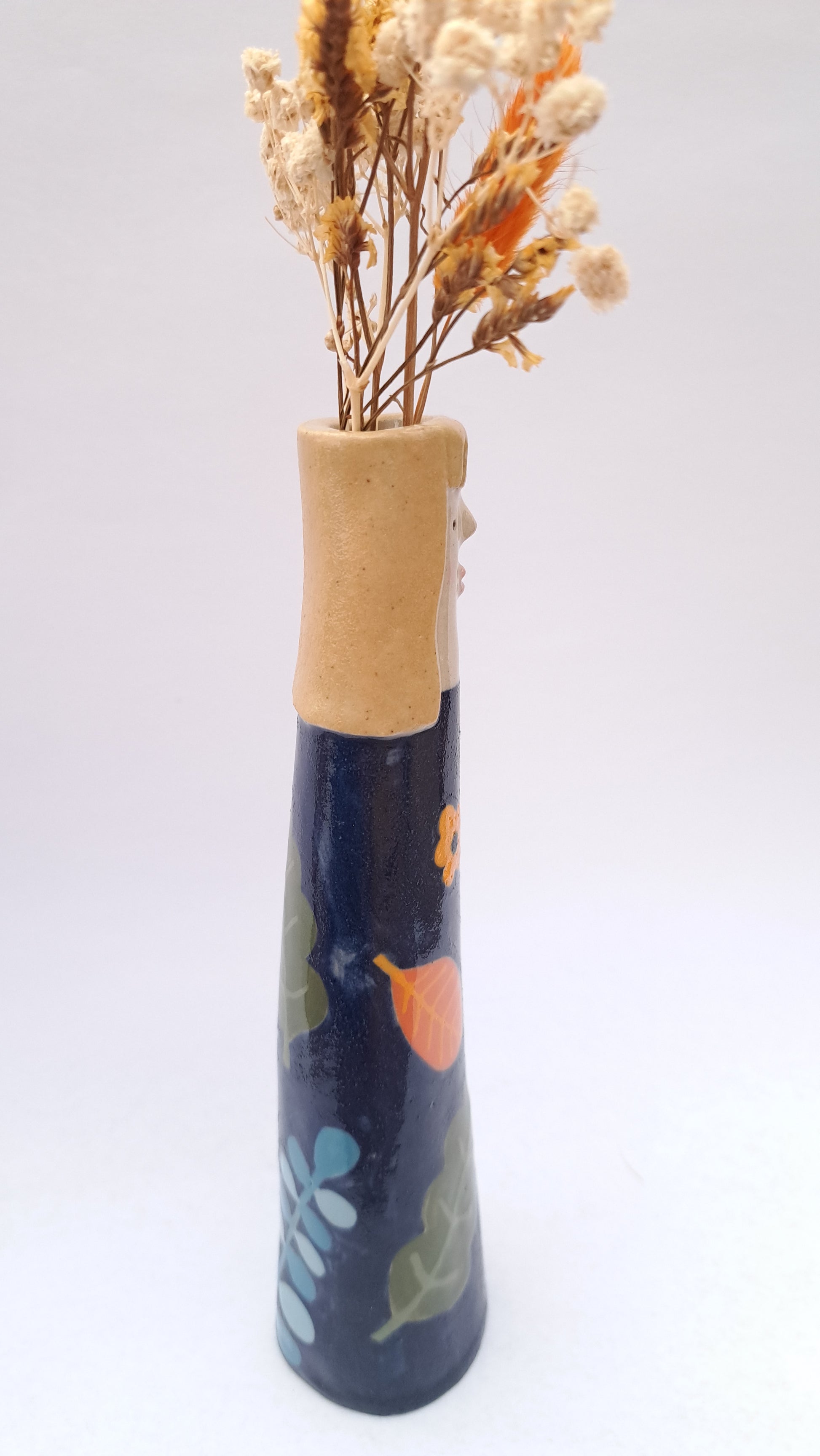 This bud vase has been hand-sculpted, coloured with slips, underglazes and finished off with a glossy transparent glaze. Each one is one of a kind and cannot be identically replicated.